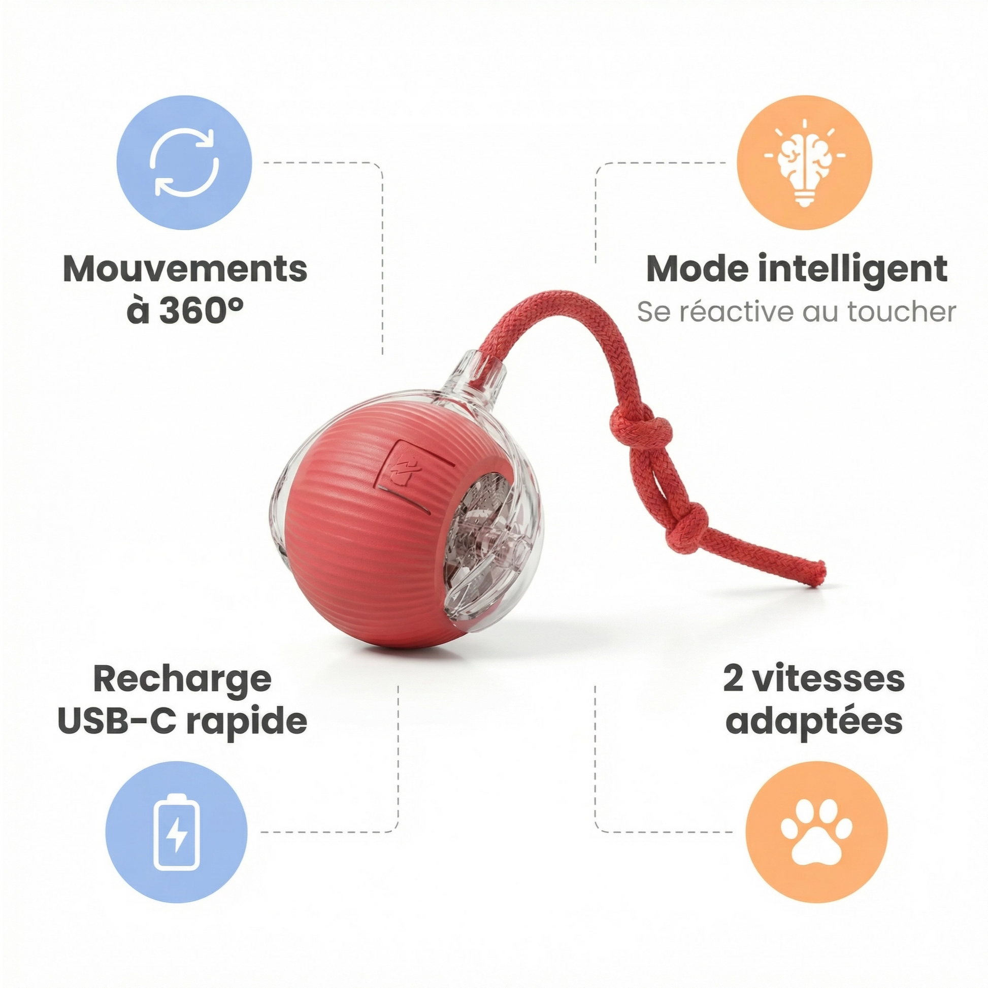 Votre chat est craintif ? Le mode lent l'aide à apprivoiser la balle en douceur. Votre chien est une pile électrique ? Le mode rapide le fait courir jusqu'à ce qu'il soit fatigué. Avec 2 vitesses et 2 modes de jeu, chaque animal trouve son rythme qu'il ait 4 mois ou 10 ans.
